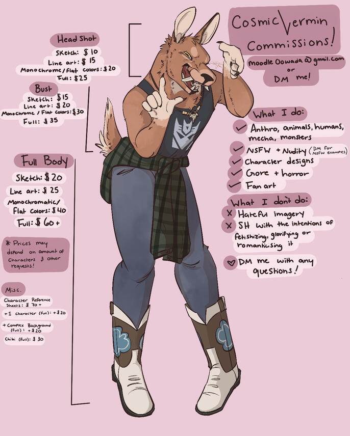 TERMS OF SERVICEWhen commissioning me, you agree that you will pay upfront. Due to AI scamming, you can either pay half upfront and the other half afterwards, or the whole amount upfront. Refunds ARE NOT available for completed pieces. Refunds before completed pieces will not be full refunds, as I have already worked and spent time on the piece.When using your commissioned piece, please credit me in some way. If you are going to resell adoptables, please price them no more than what you've bought them for, unless of course they've gotten more art.Commission times will vary, as I am a full time college student with a job :')If you have any questions, feel free to directly message me!